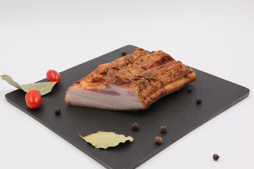 Bestanddeler (ingredienser):svikekjøtt bacon 95 %, salt. Næringsverdi til 100 g produkt: energisk verdi – 2733 kJ/664 kcal; fetter – 72,5 g, av dem 25,38 g mettede fettsyrer; hydrokarbonater – 0, av dem 0 g sukker; proteiner – 3 g; salt – 5,7 g. Oppbevarings vilkår: 0-20OC